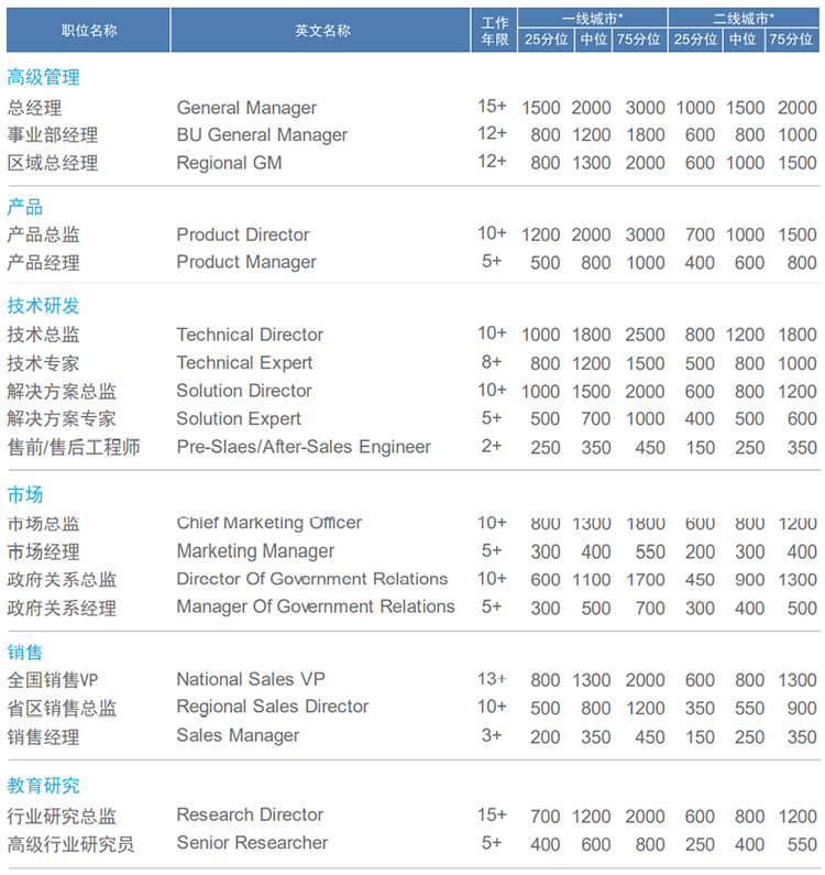 基本年薪*:以人民币1000元为单位,指年度整体的现金收入=年度底薪+年度固定部分奖金